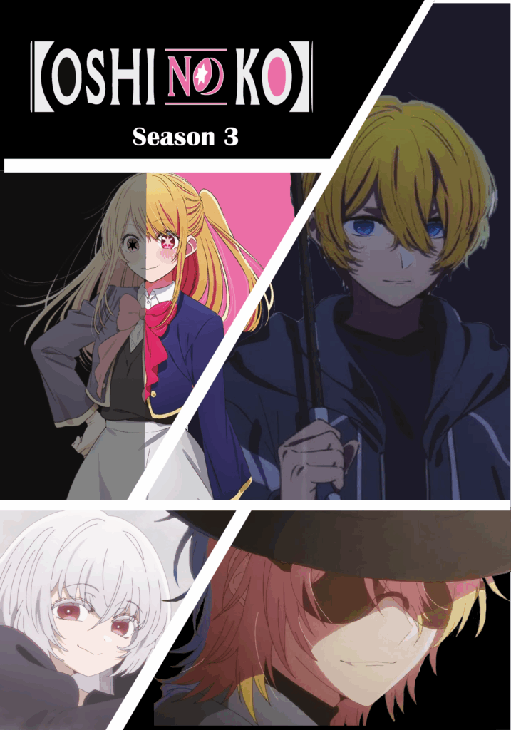 Este poster esta inspirado en lo que se espera de la tercera temporada del anime llamado Oshi No Ko, se muestran 4 personajes que forman parte importante del anime mayormente conformado con colores oscuros debido al rumbo que va tomando la historia.