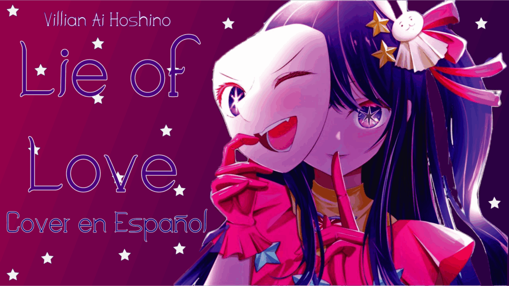 Este diseño es para la portada de un video, específicamente para un cover de una canción, tiene el contexto del video el cual es «Villian Ai Hoshino», el nombre de la canción «Lie of Love» y que es un cover en español, al lado de los textos hay una imagen del personaje Ai Hoshino, el cual es la protagonista de la canción, en el fondo se ven los colores rosas y morados los cuales son colores que la protagonista usa mucho junto a unas estrellas, elemento muy importante dentro de su anime.